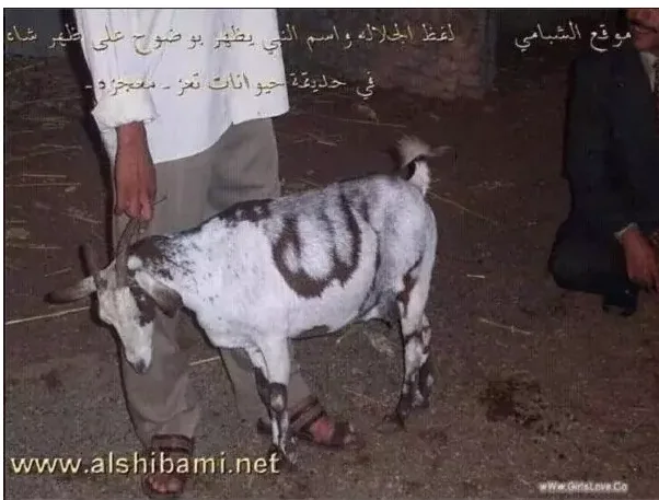 According to online reports, the name of God (Allah) and Prophet Muhammed came out of the body of a goat in an unnamed Arab country.